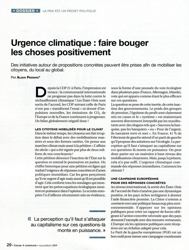 URGENCE CLIMATIQUE : FAIRE BOUGER LES CHOSES POSITIVEMENT ("Cause Commune" - Juillet Août 2019 - Revue d'action politique du PCF)