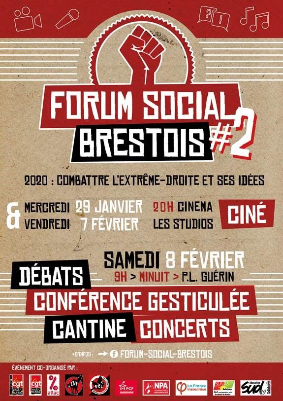 Vous trouverez ci dessous le programme du Forum Social Brestois organisé par : CGT Éducation, Solidaires, FSU, CNT, VISA, ATTAC, UCL, Alternative UBO, PCF, NPA, FI ,sur le thème combattre l'extrême droite et ses idées .