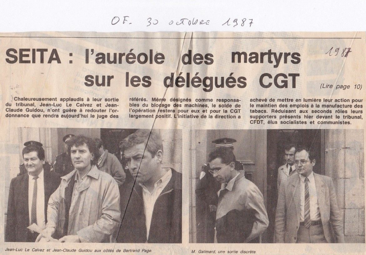 "Chaleureusement applaudis à la sortie du tribunal, Jean-Luc Le Calvez et Jean-Claude Guidou n'ont guère à redouter l'ordonnance que rendra aujourd'hui le juge des référés. Même désignés comme responsables du blocage des machines, le solde de l'opération restera pour eux et pour la CGT largement positif. L'initiative de la direction a achevé de mettre en lumière leur action pour le maintien des emplois à la manufacture des tabacs. Réduisant aux seconds rôles leurs supporters présents hier devant le tribunal, CFDT, élus socialistes et communistes".
