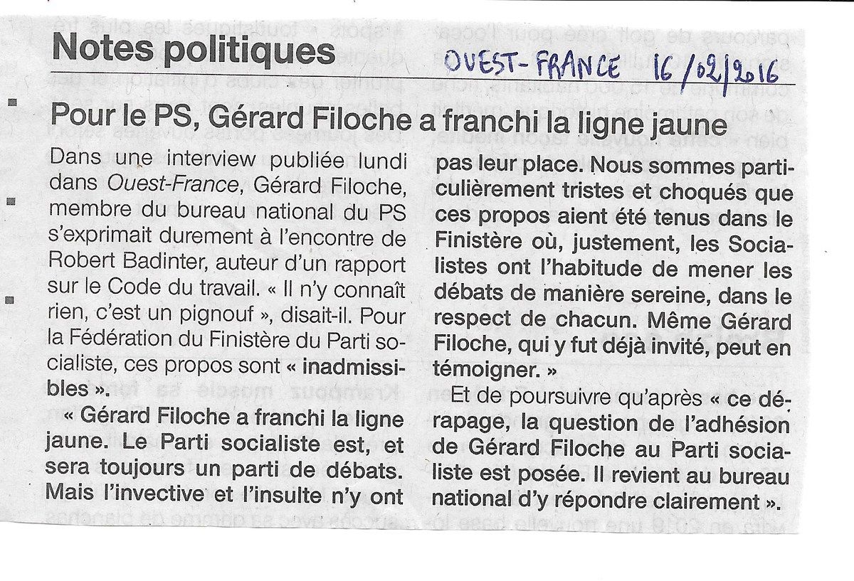 Ouest-France, 16.02.2016: Le PS Finistère pour l'exclusion de Gérard Filoche qui a franchi la ligne jaune "des briseurs de grève"?